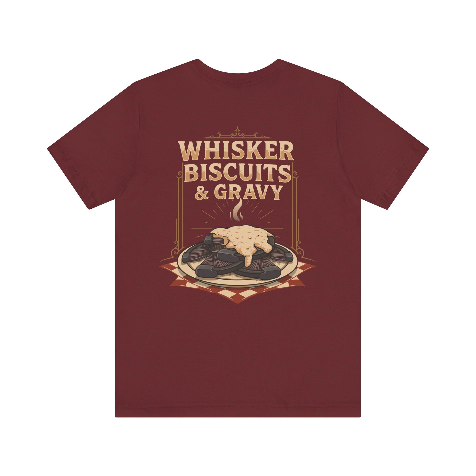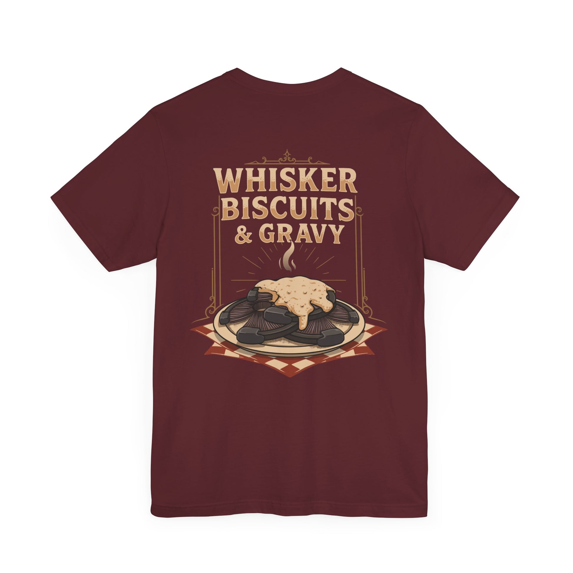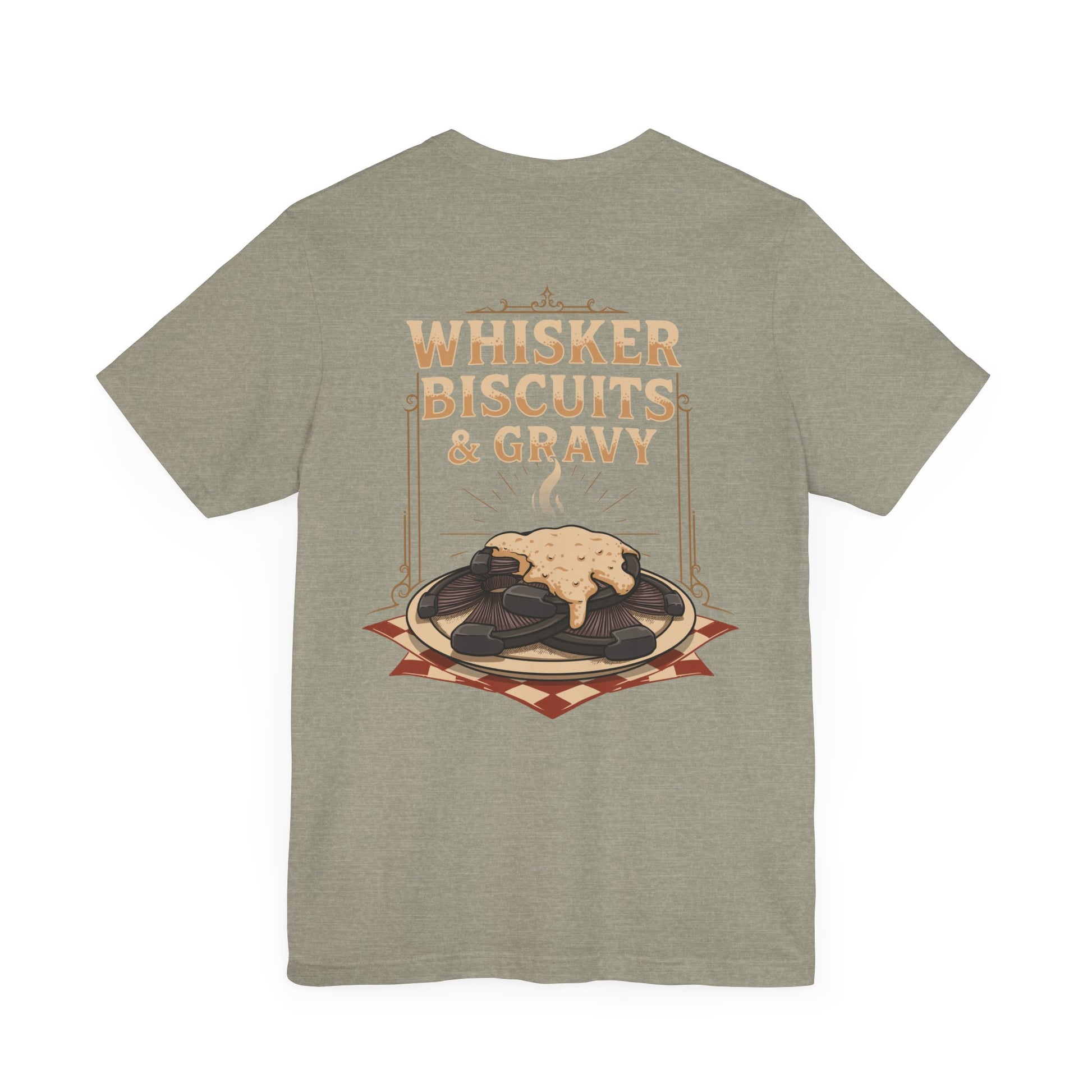 This ain't your grandma's breakfast. Featuring a piping hot pile of Whisker Biscuits in steamin’ hot gravy, this shirt delivers a hearty helping of style for the hunter who lives for early mornings, tree stands, and down-home meals after the shot.